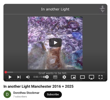 In 2016, I presented my book “Like a Wave from another Shore / After-Death Communication between Art and Psychotherapy” co-authored with Juliane Grodhues, to Canon Dr. David Holgate at Manchester Cathedral. Showing great interest, he offered a cathedral space for my digital art slideshow “In another Light—Living with death,” using art as therapy, reflecting my grief counselling work. It was also shared on the cathedral’s website as “Aspects of Black.”