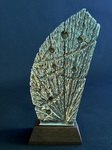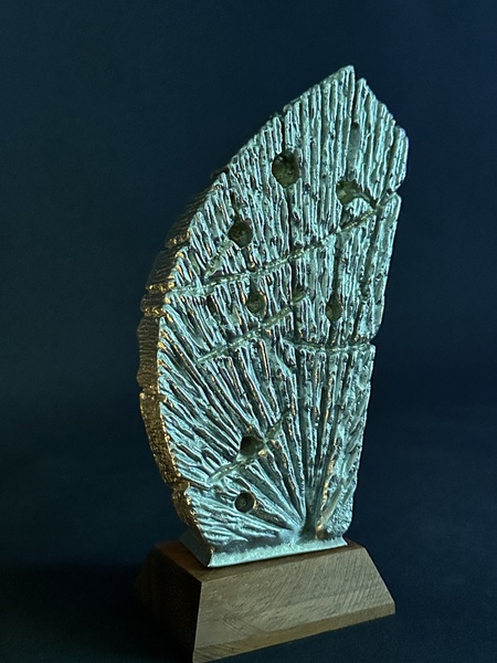 The 2026 ITIA student award artwork, sparked by Dorothea Stockmar's painting, In Another Light, celebrates the blessing of light. Reimagined as an ancient weathered rune-stone, slender cruciform figures rise heavenly up amidst rays of hope. Titled Ascend: In Another Light, this piece is hand crafted and cast in solid Sheffield pewter. Comes with a removable hardwood base.
